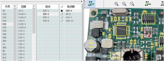 在結(jié)點(diǎn)列表中選中一個結(jié)點(diǎn), 或者通過在電路板圖像上點(diǎn)擊器件管腳來選中它所在的結(jié)點(diǎn):